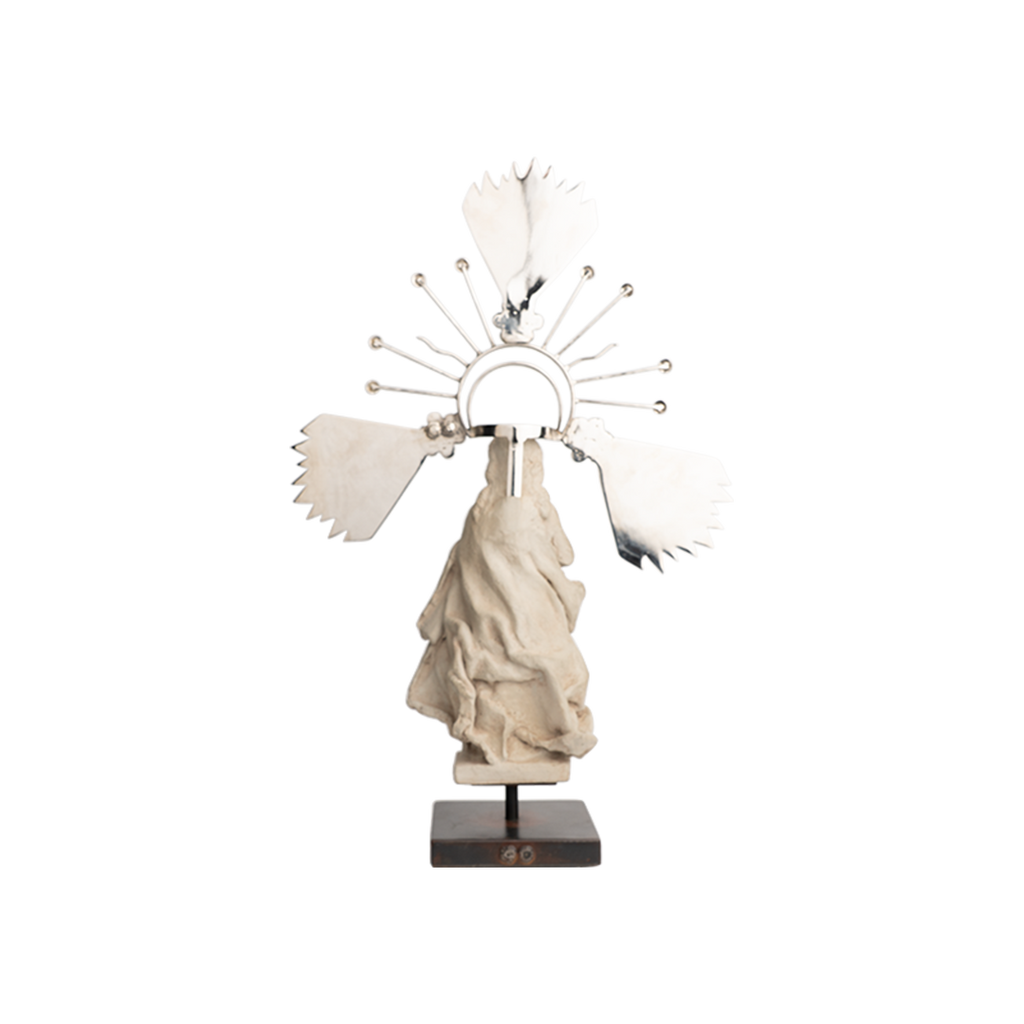 Wax cast stone virgin on iron stand with a removable nickel-plated iron halo aura . . . robed in majesty