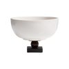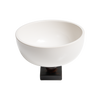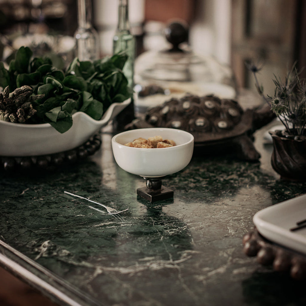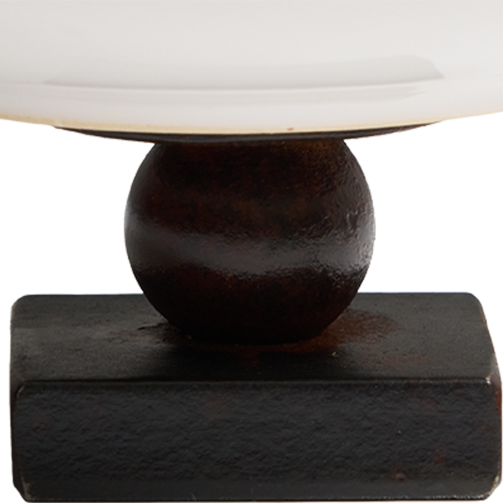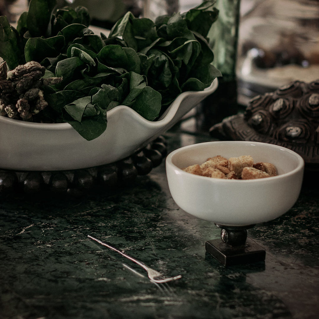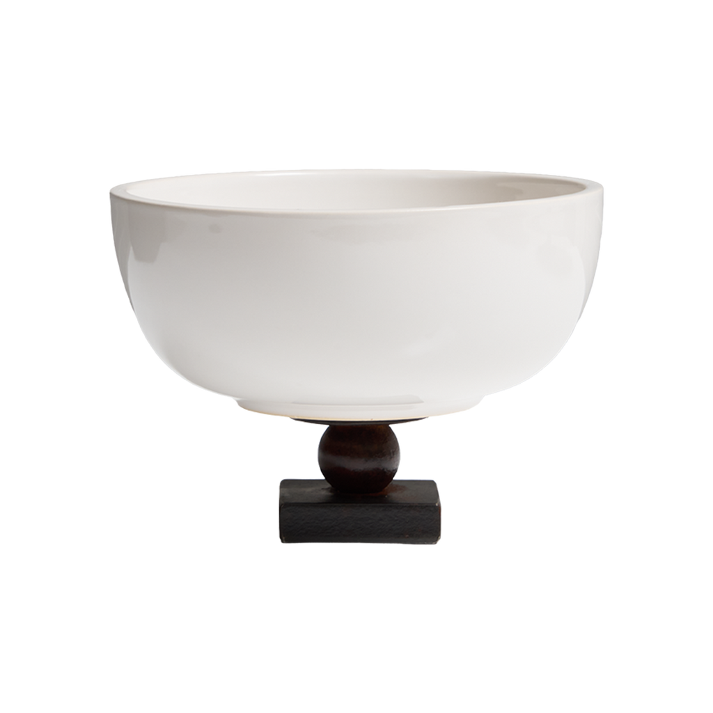 Small white ceramic bowl on top of a wax cast iron stand