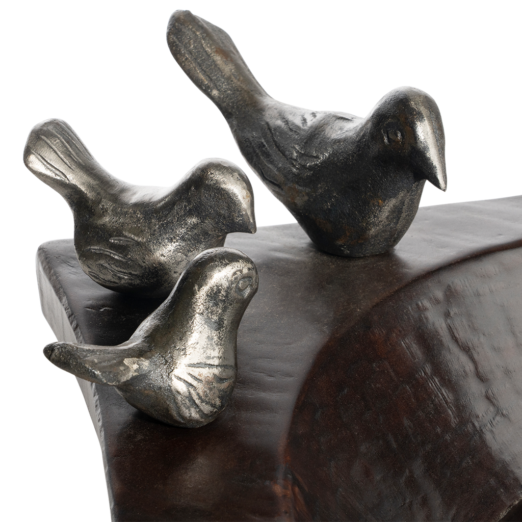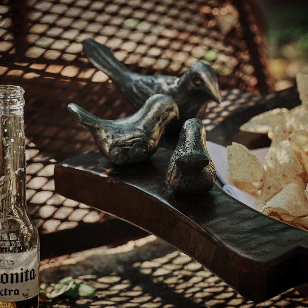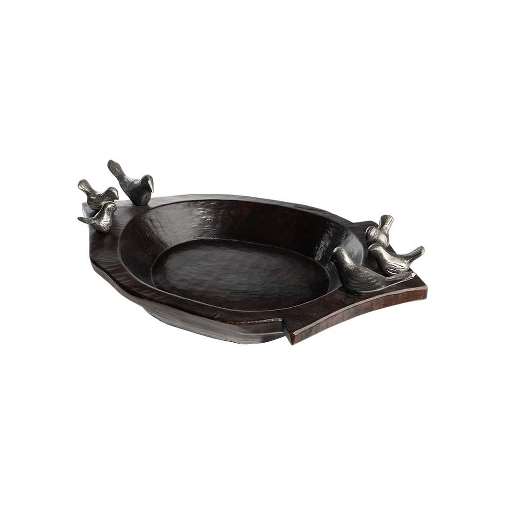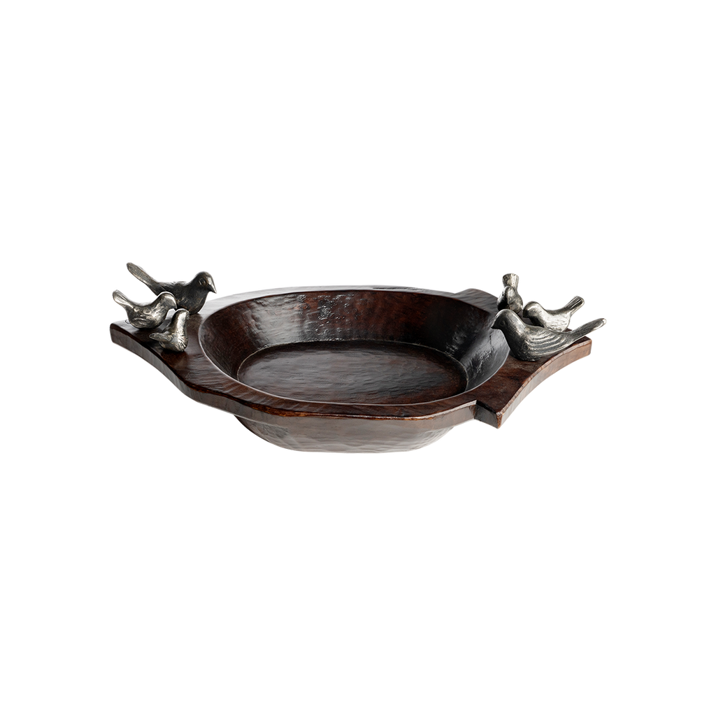 Hand carved primitive wood bowl with a family of six wax cast iron birds - mama, dada and four pollitos . . .