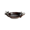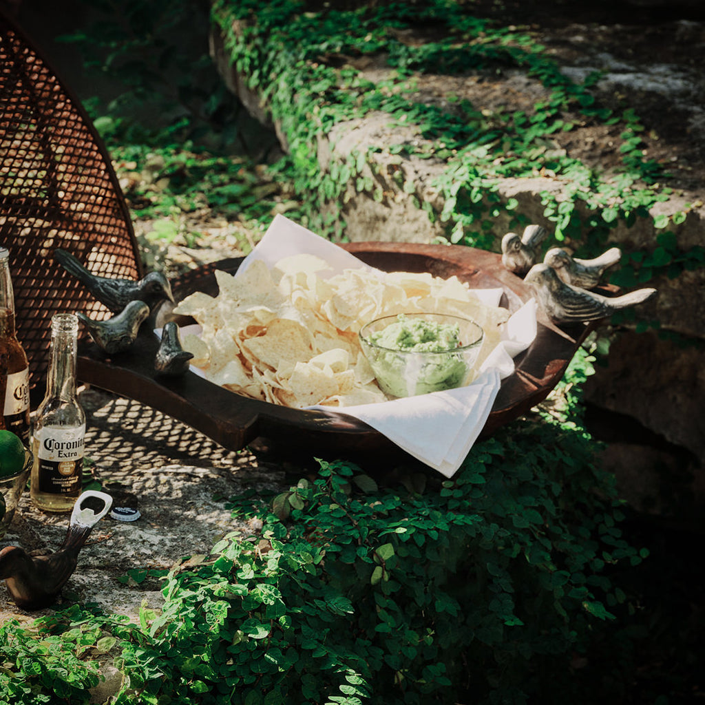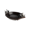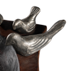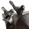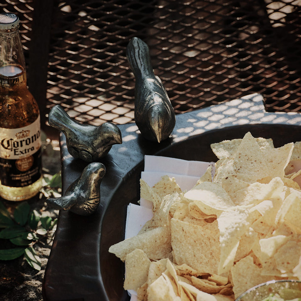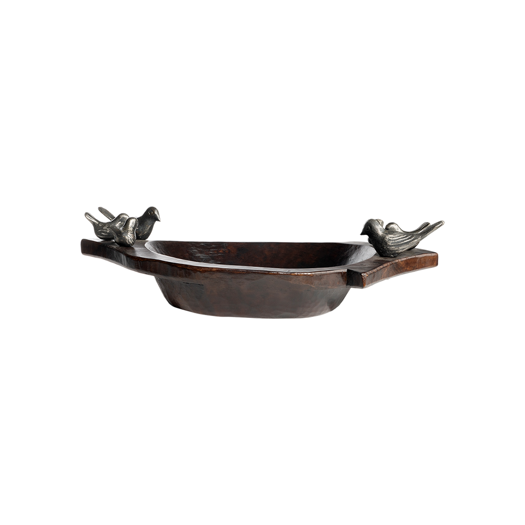 Hand carved primitive wood bowl with a family of six wax cast iron birds - mama, dada and four pollitos . . .