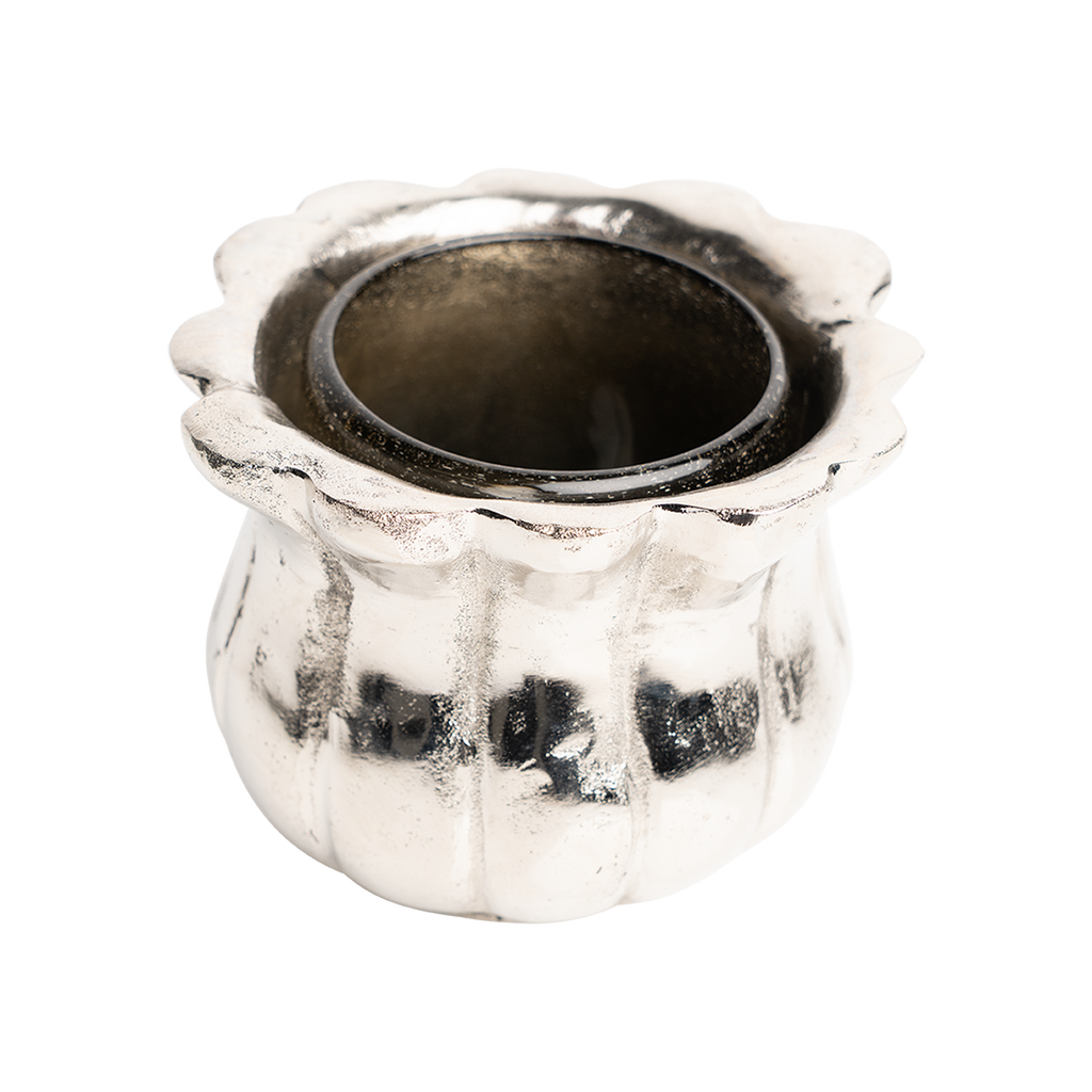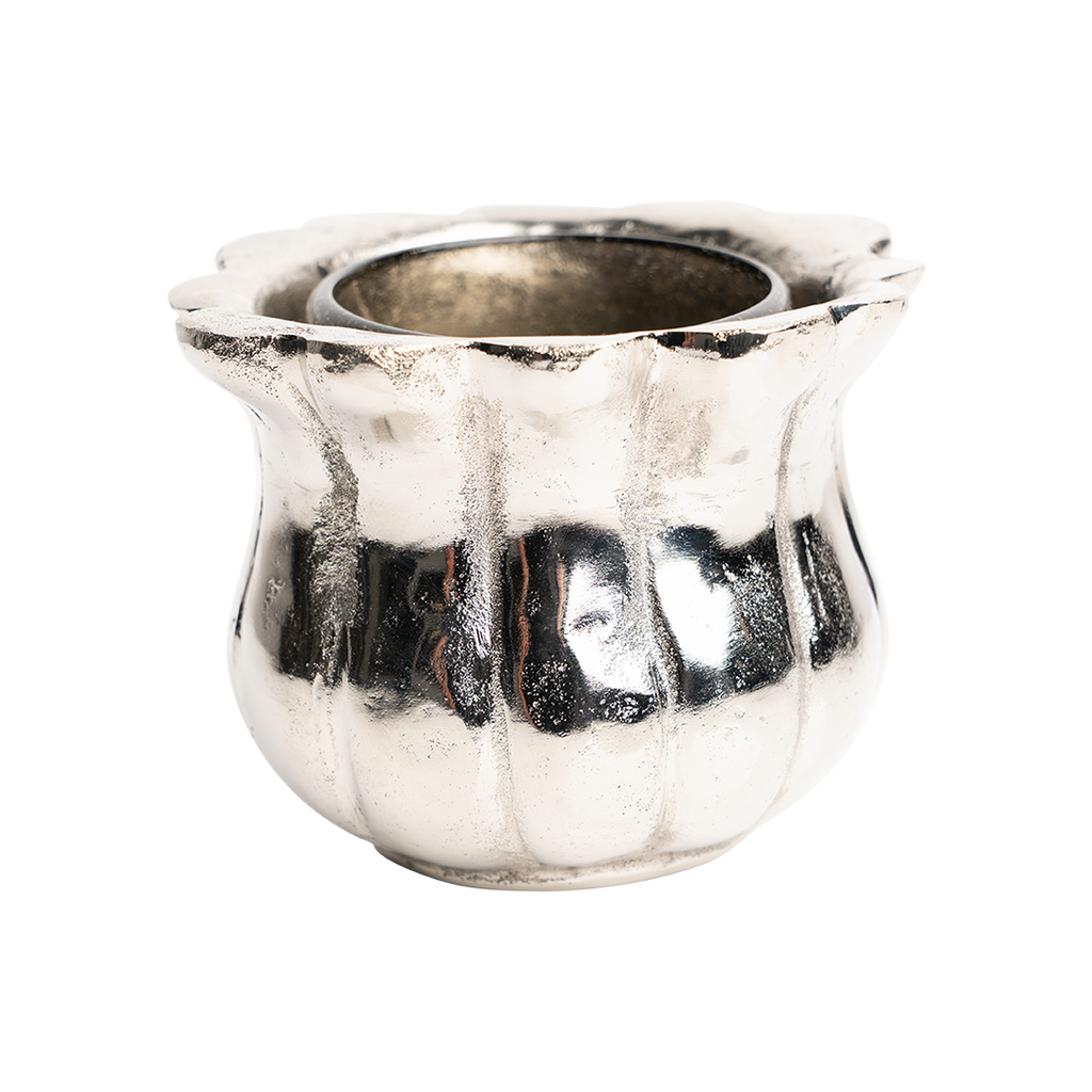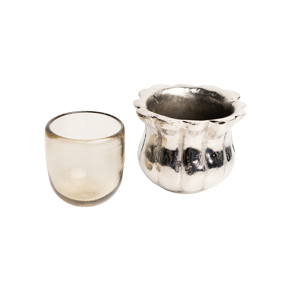 Nickel plated cast iron flower cachepot with removable mouth blown glass insert . . . votive, vase, wine holder