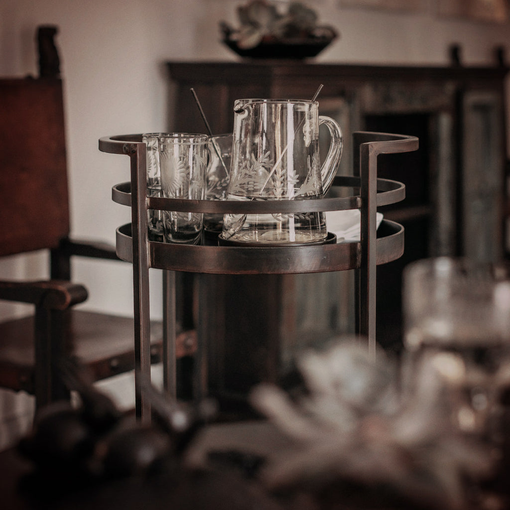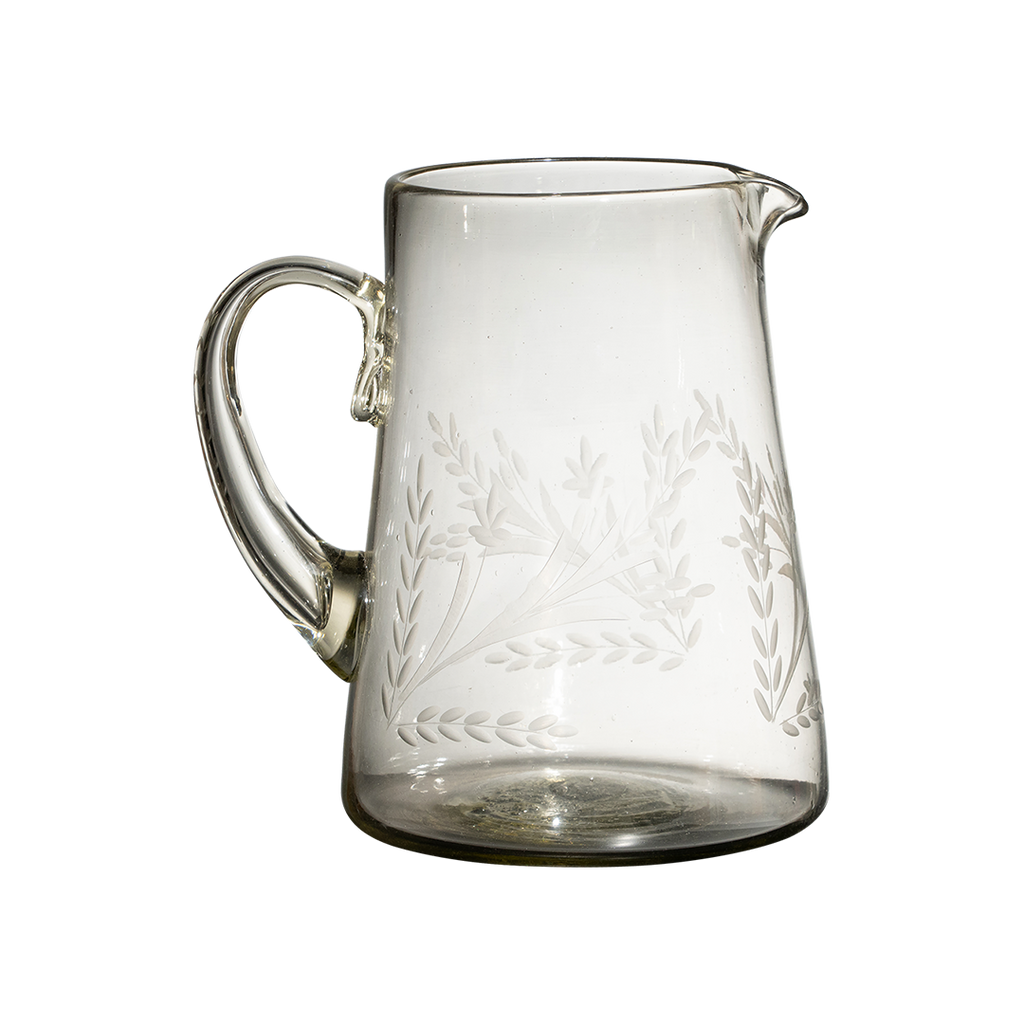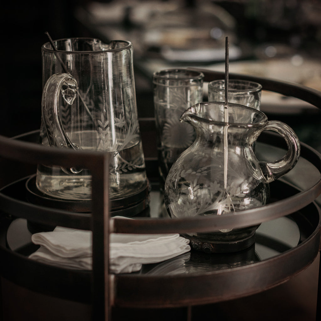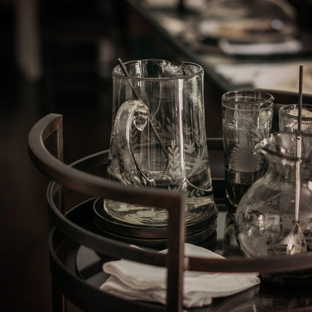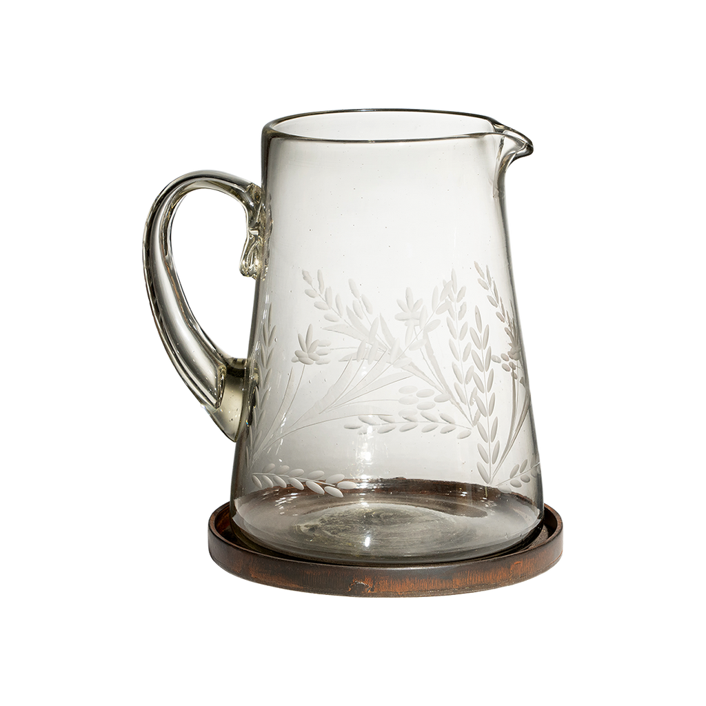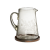 Traditional clear mouth blown glass pitcher with pepita engraving on a removable iron coaster lined with suede. . . lemonade, tea, water, cocktails . . . pairs great with our Cuchara spoon