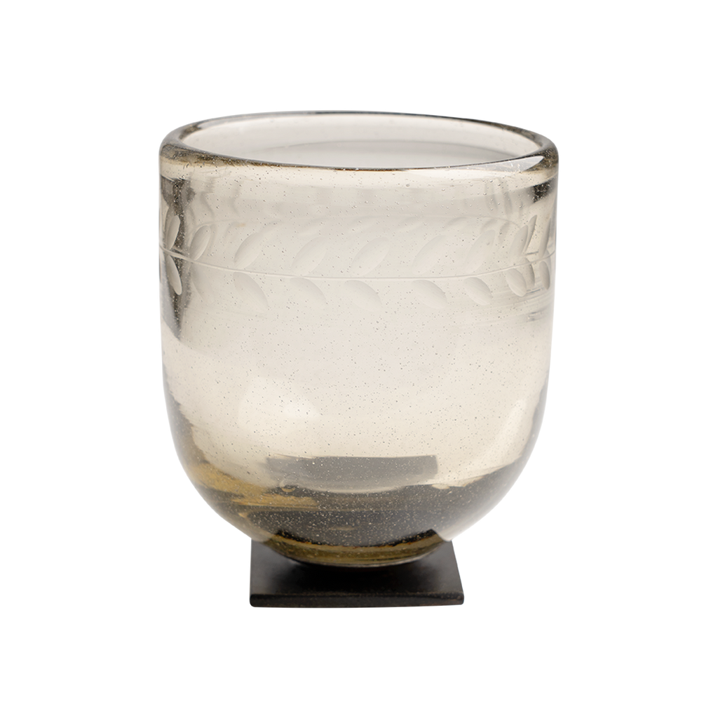 Mouth blown vessel with loose laurel engraving on an iron base. Wine, votive, vase, condiments...