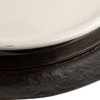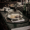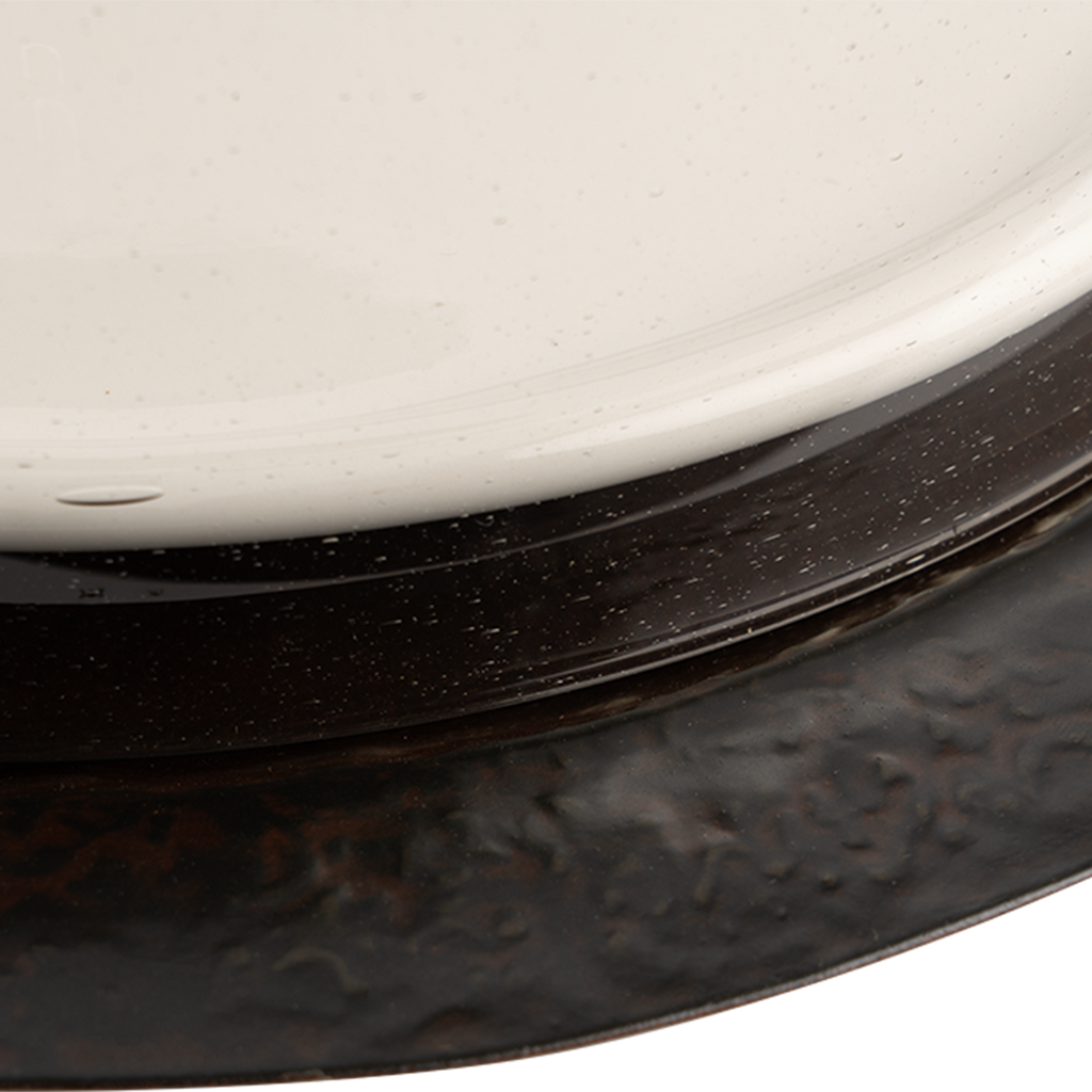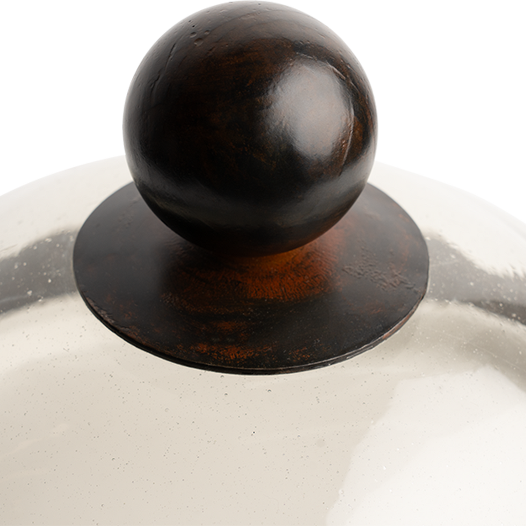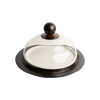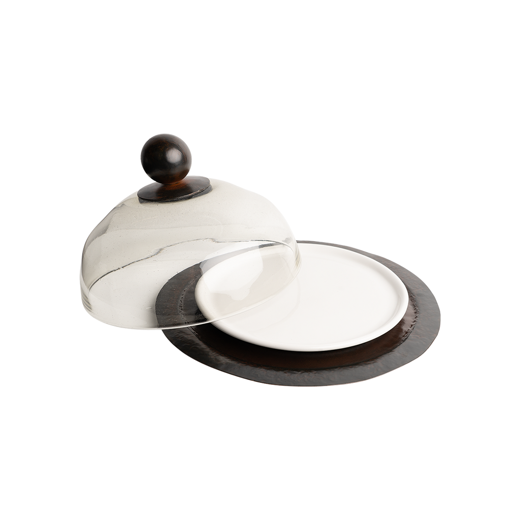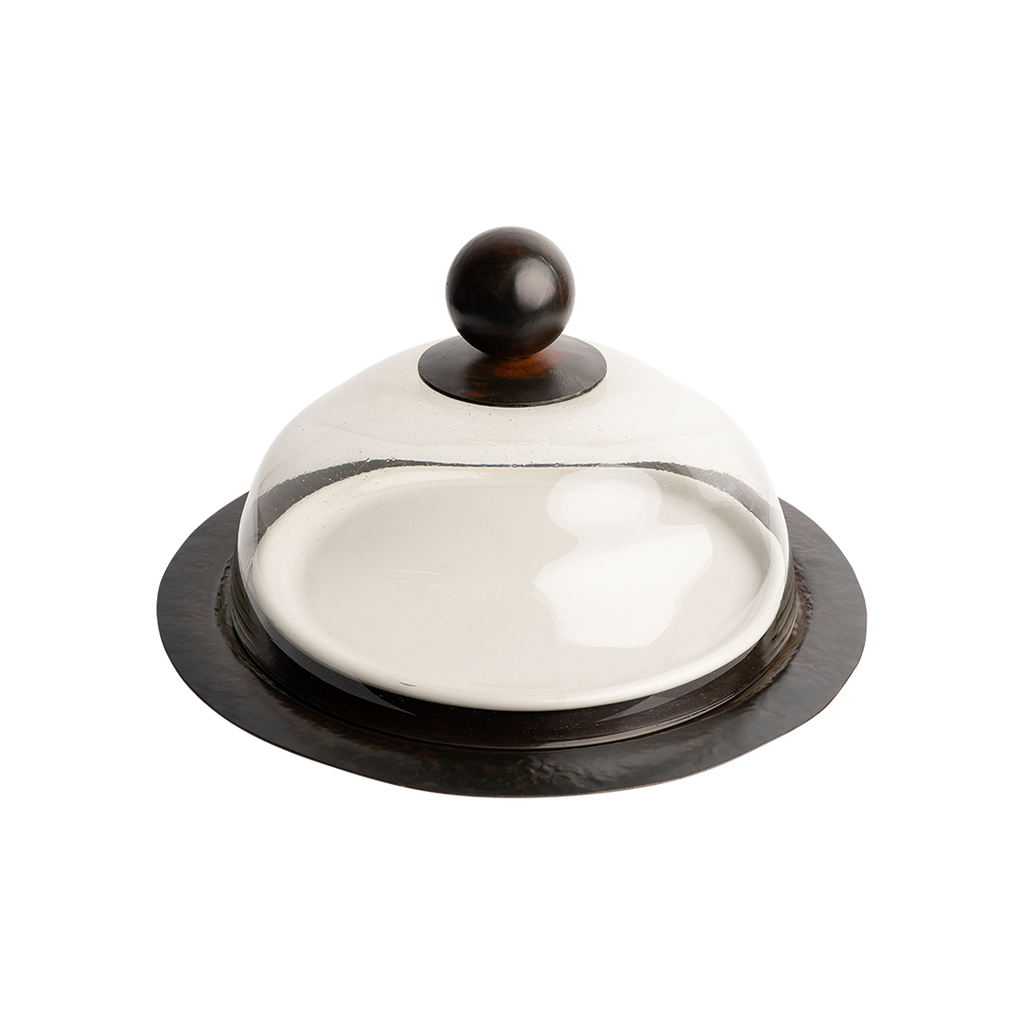 Say cheese! Mouth blown glass dome with balin top resting on a hammered iron round platter with a removable 12" white ceramic platter