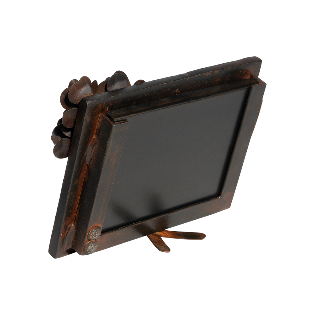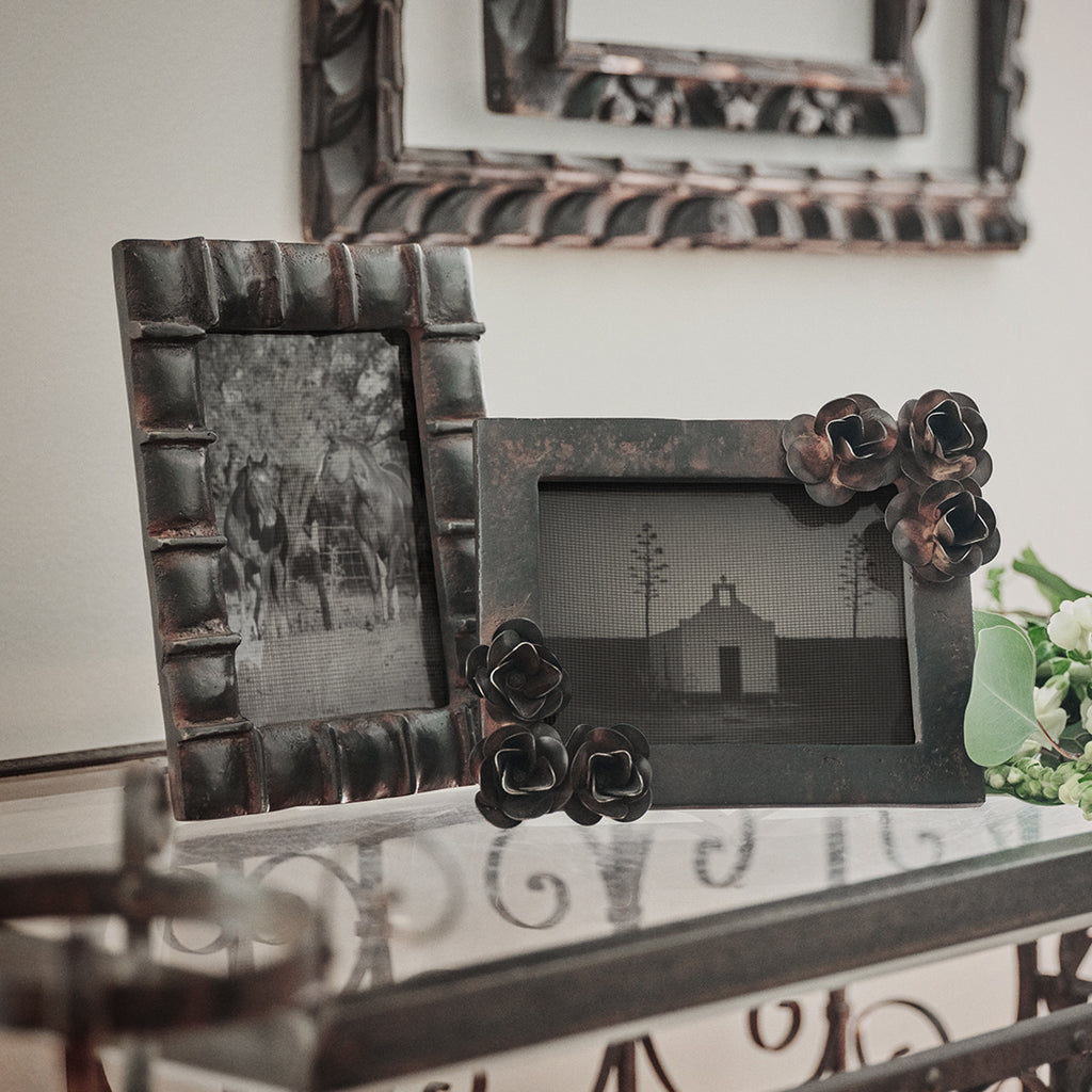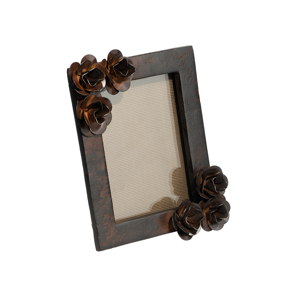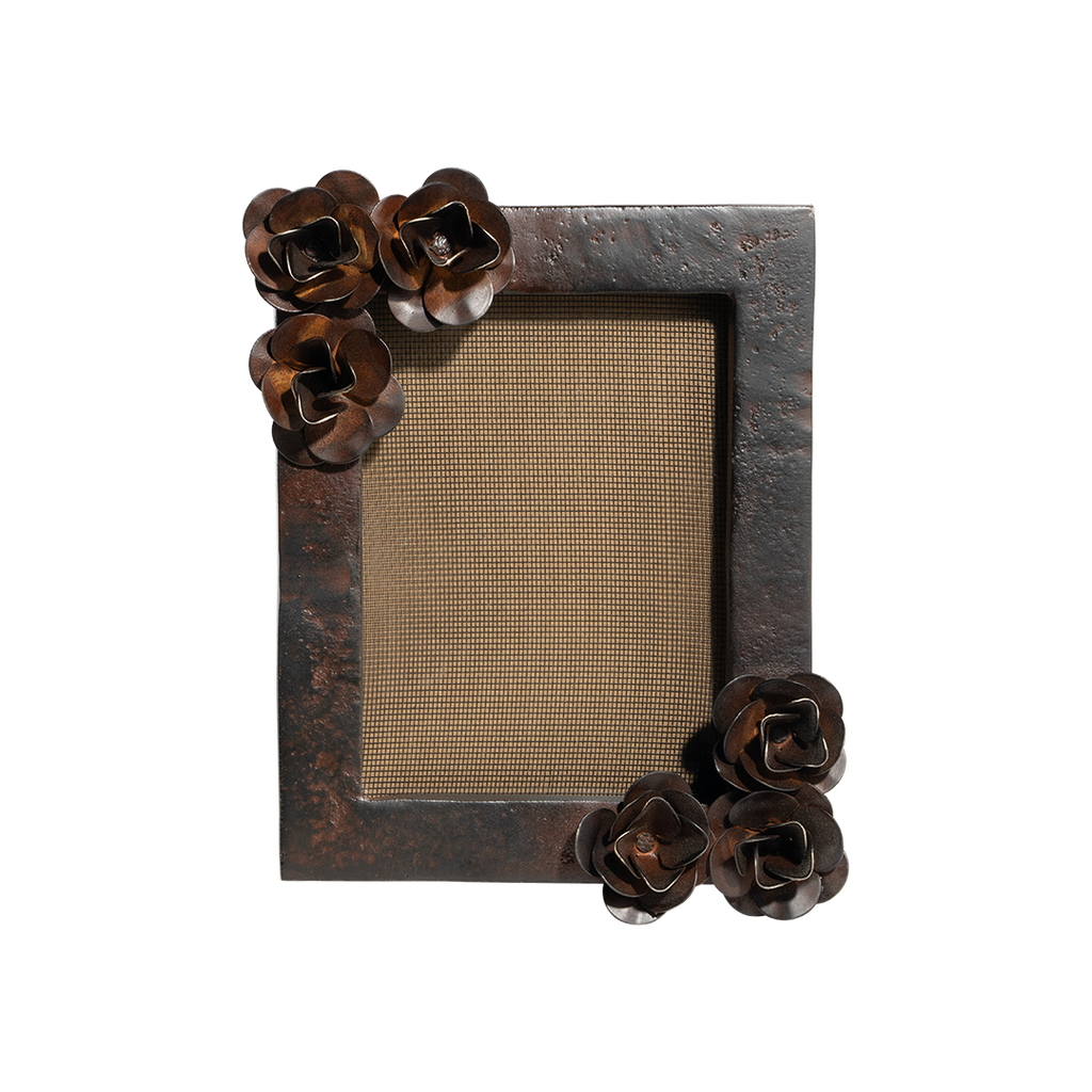 Beautiful wax cast iron 5 x 7" frame with hand forged iron roses . . . can be used for vertical or horizontal display . . . a rose by any other name . . .