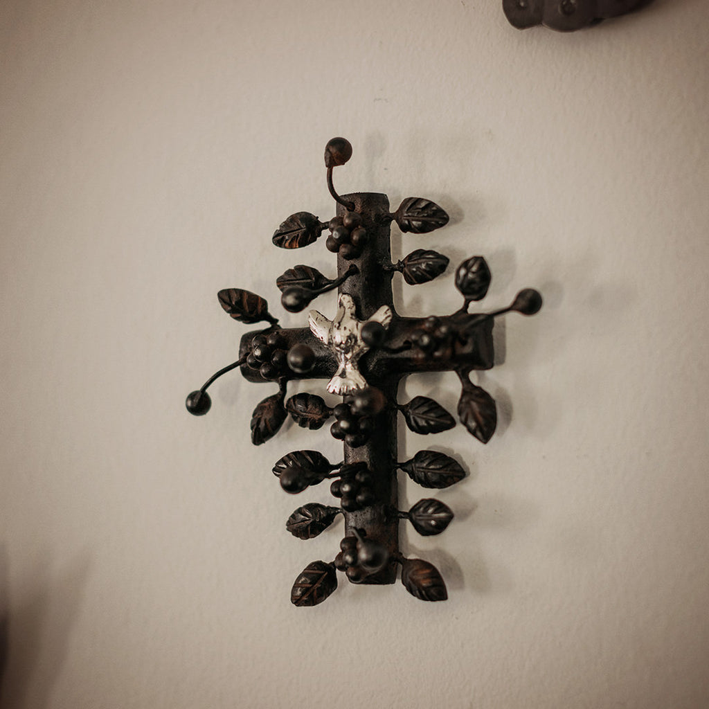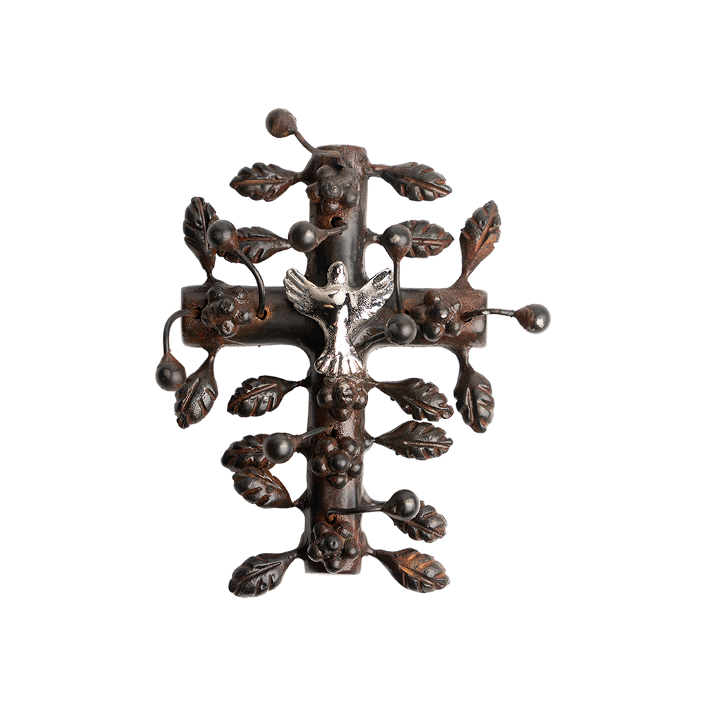 Hand rubbed wax cast and forged iron artisan cross with a nickel-plated small dove center . . . peace and love . . .
