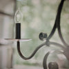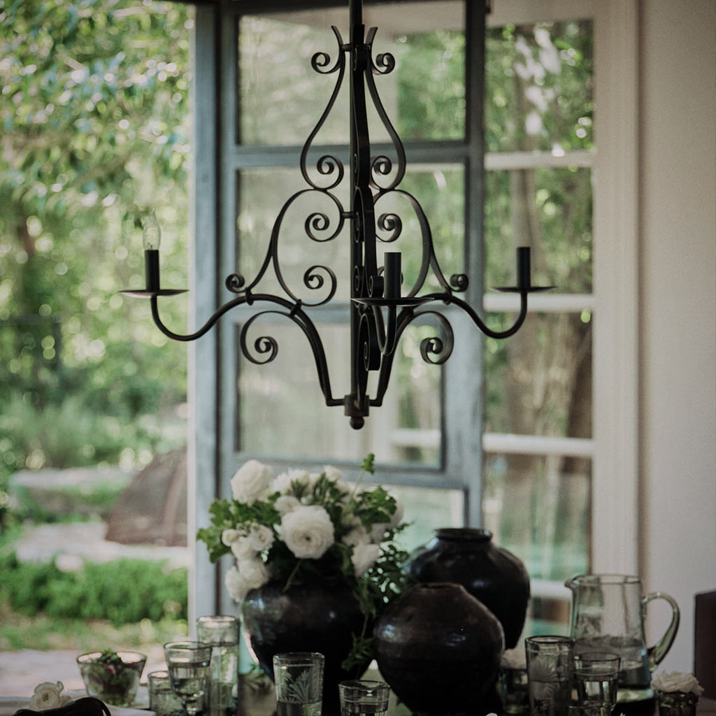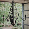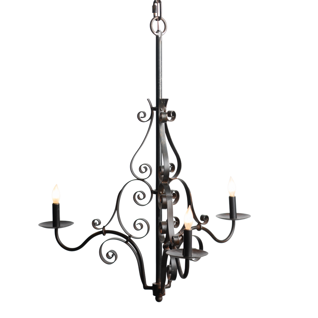 Timeless three arm scrolling hand forged iron chandelier. UL Electrified. 36-inch chain & canopy included