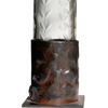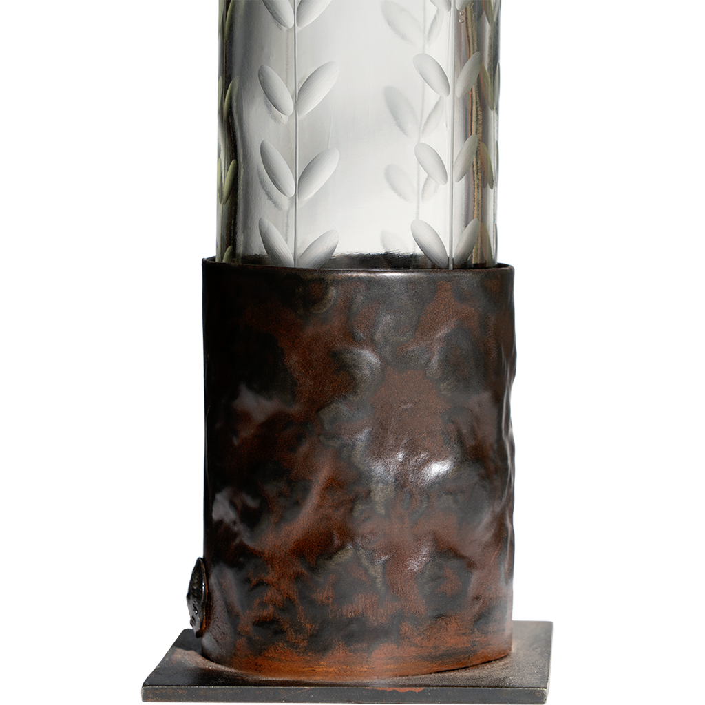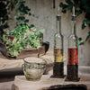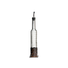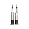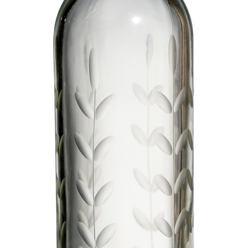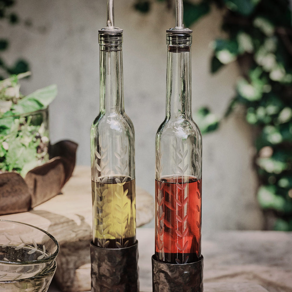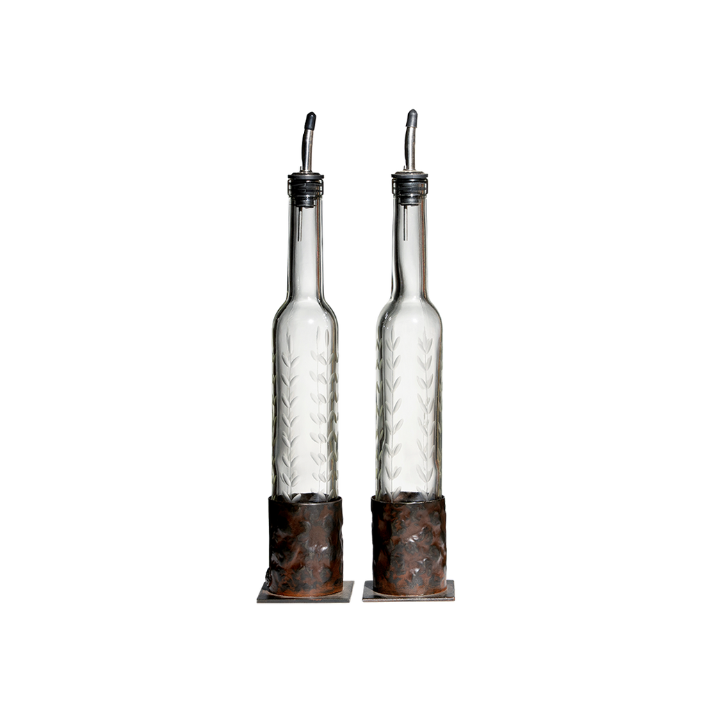 Twin glass bottles each engraved with vertical laurels with a hammered iron removable coaster. Stainless steel and rubber removable spout. Perfect for oil & vinegar . . . or liquid soaps . . .
