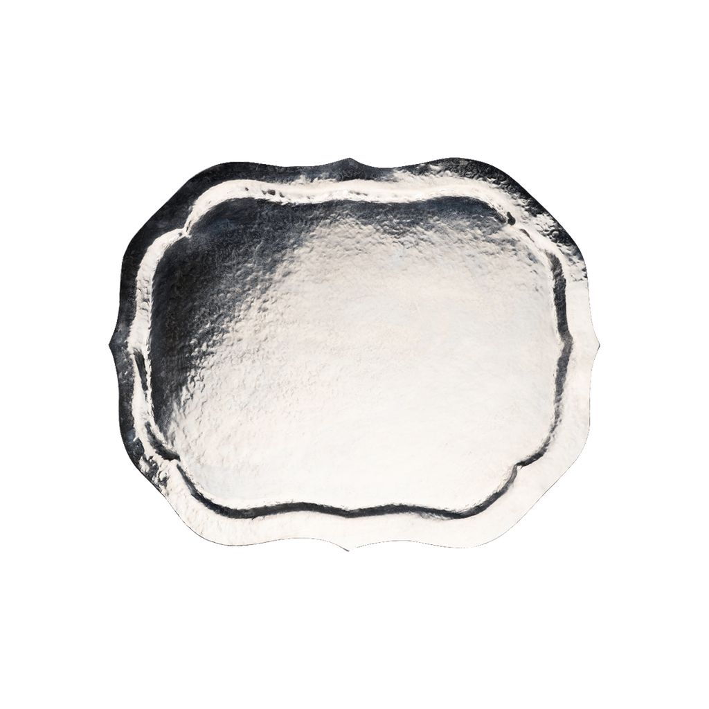 Sculpted medallion style nickel plated hammered iron tray. For the bar, vanity, library, bedside...