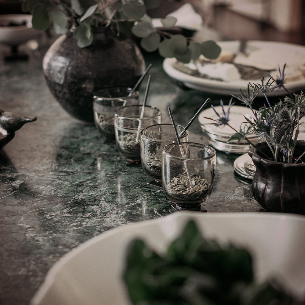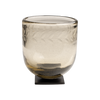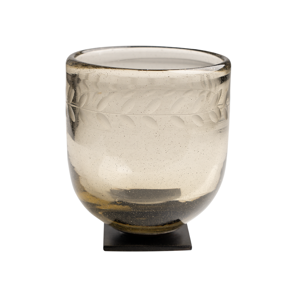 Mouth blown vessel with loose laurel engraving on an iron base. Wine, votive, vase, condiments...