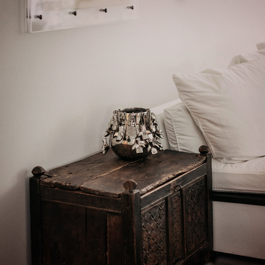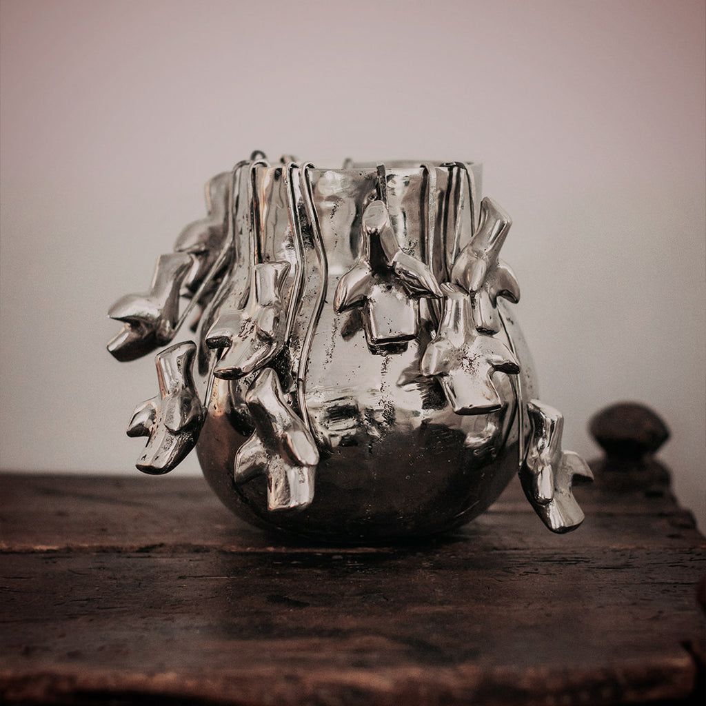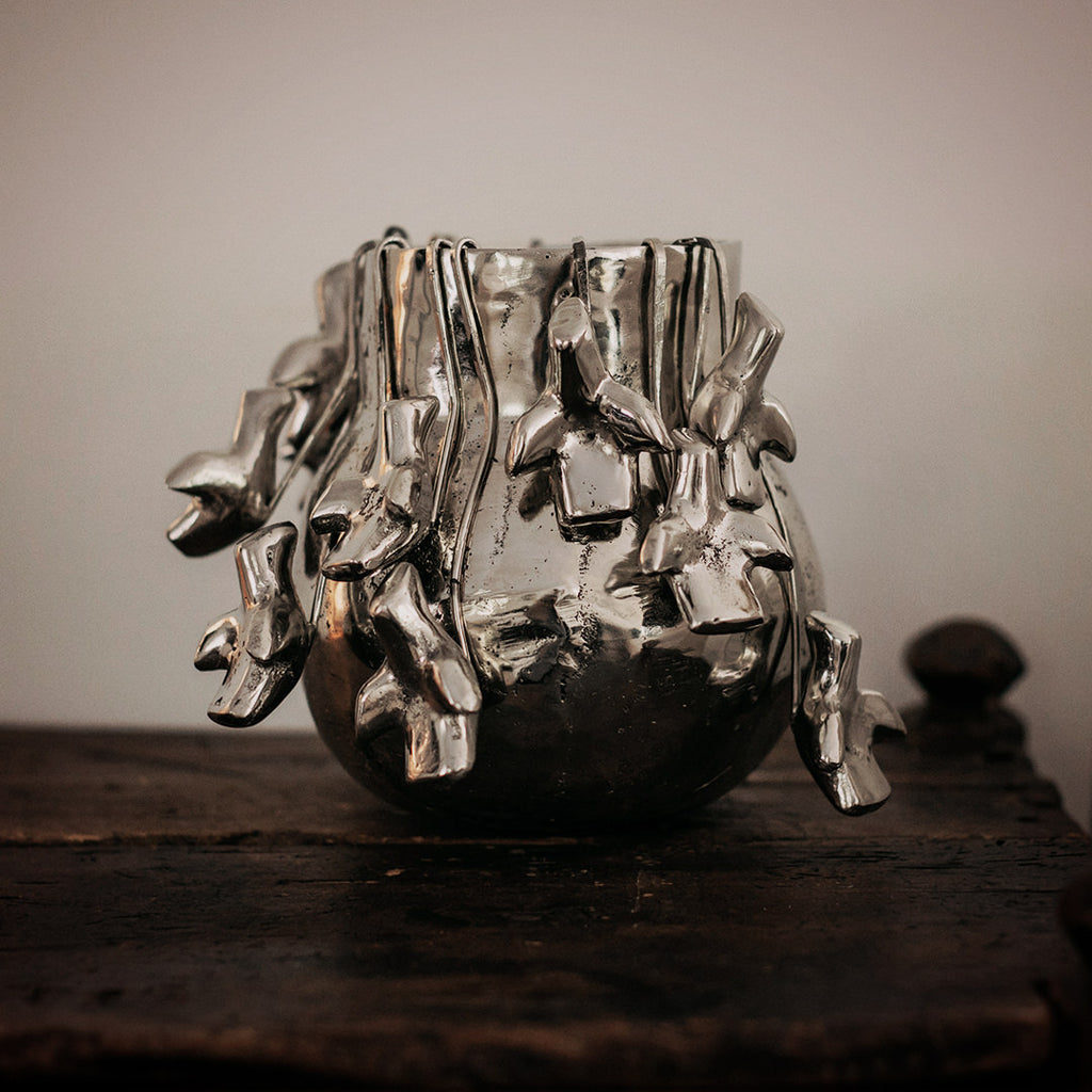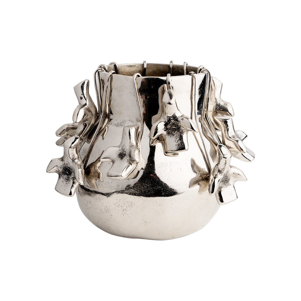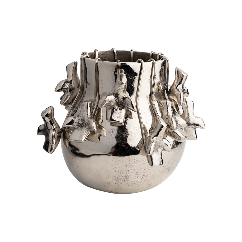 Nickel plated wax cast iron bean pod with 12 removable nickel-plated iron palomas on hooks - 4 in three different lengths - arrange to your own liking . . . a true collector's item . . . birds of a feather . . .