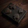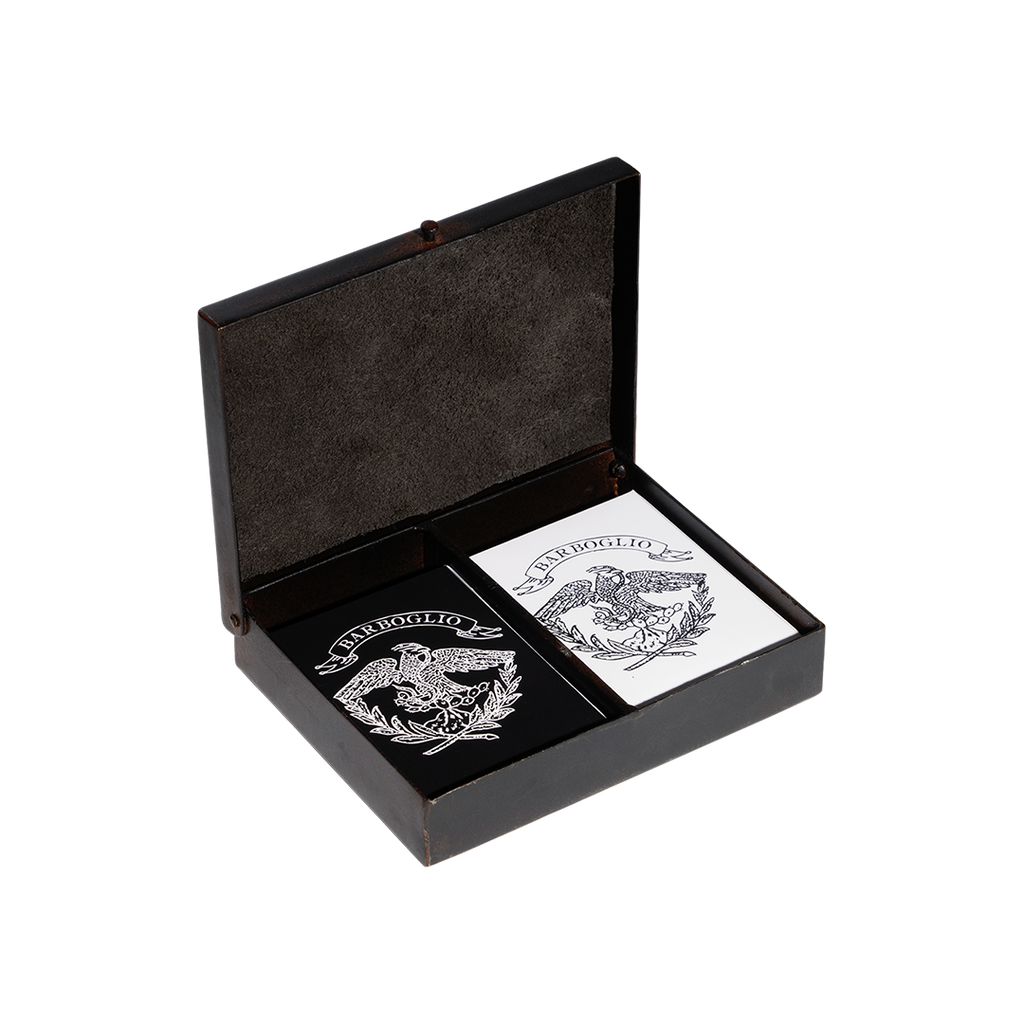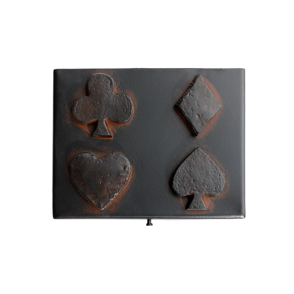 Four of a kind. Hand forged iron playing cards box with cast iron diamond, spade, club and heart. Contains two sets of Jan Barboglio playing cards