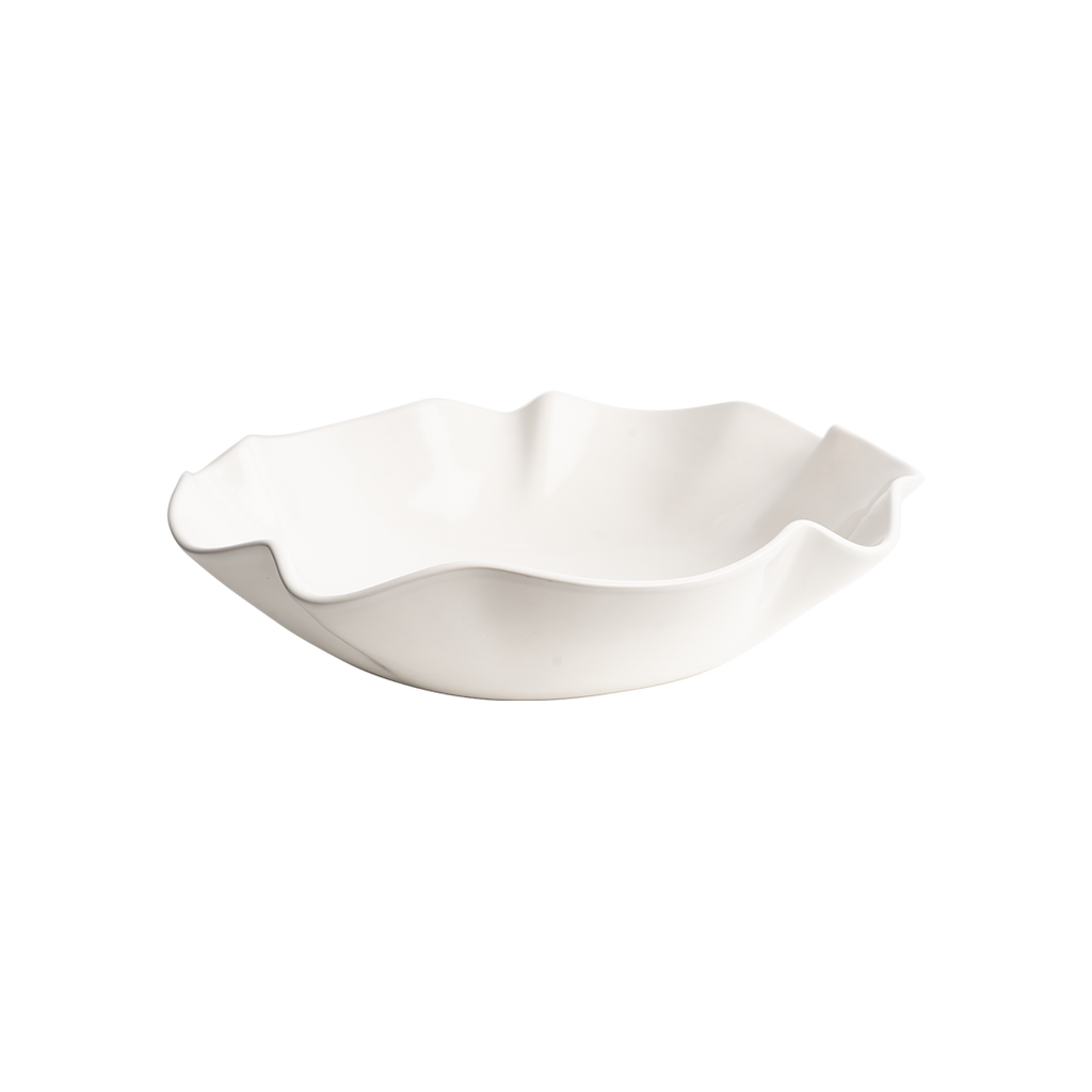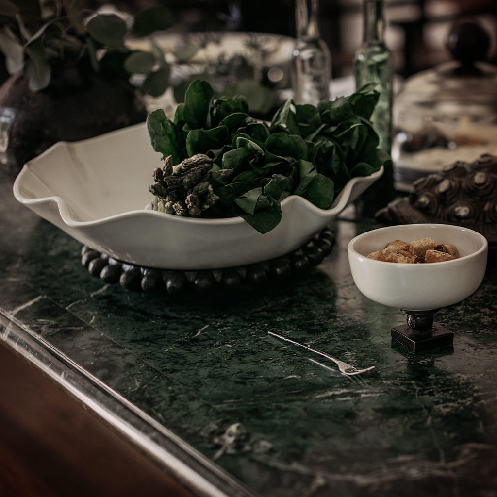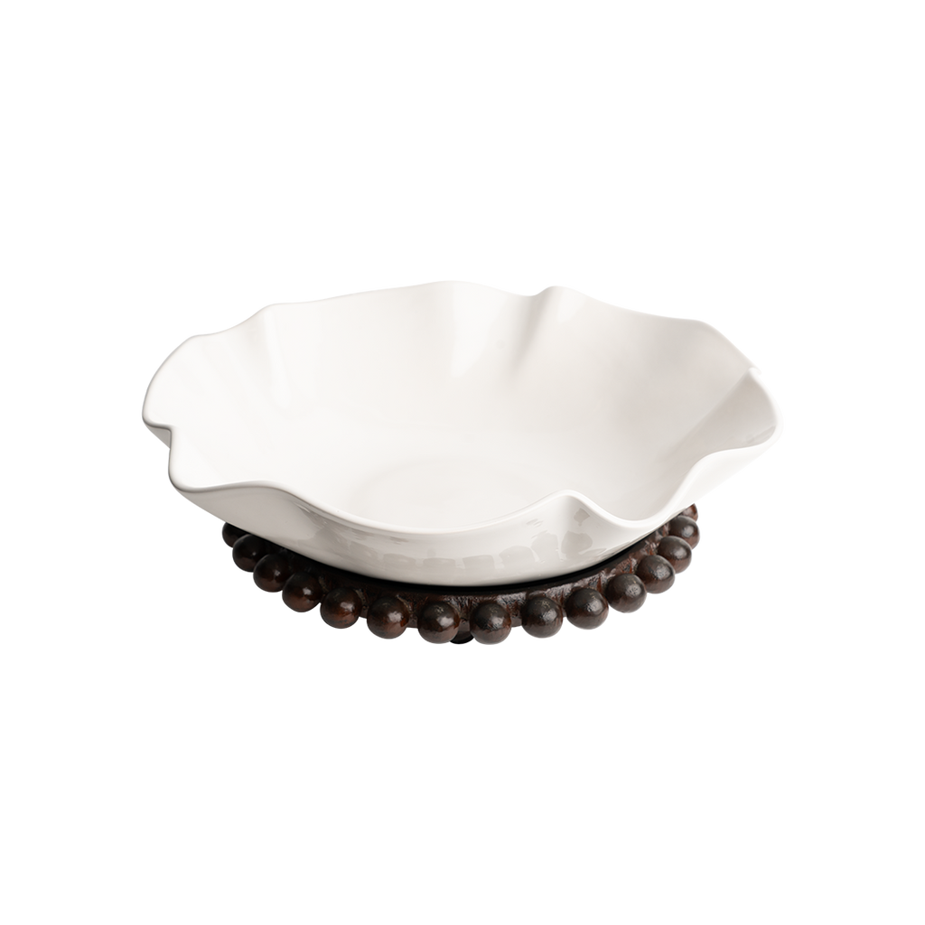 Creamy white wavy ceramic bowl resting atop a removable cast iron beaded balin tray . . . a classic entertaining piece. Tray can easily be used separately - for bar, vanity, study . . .