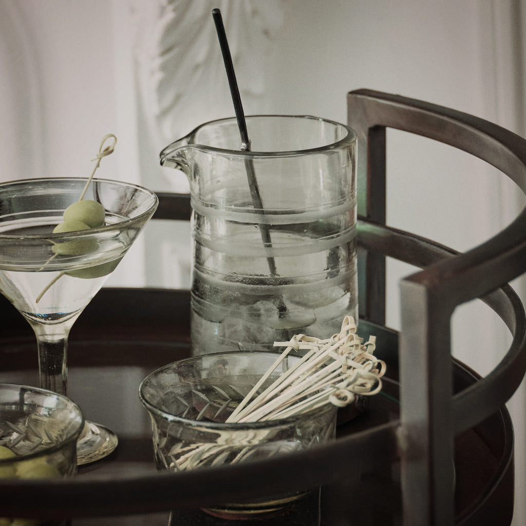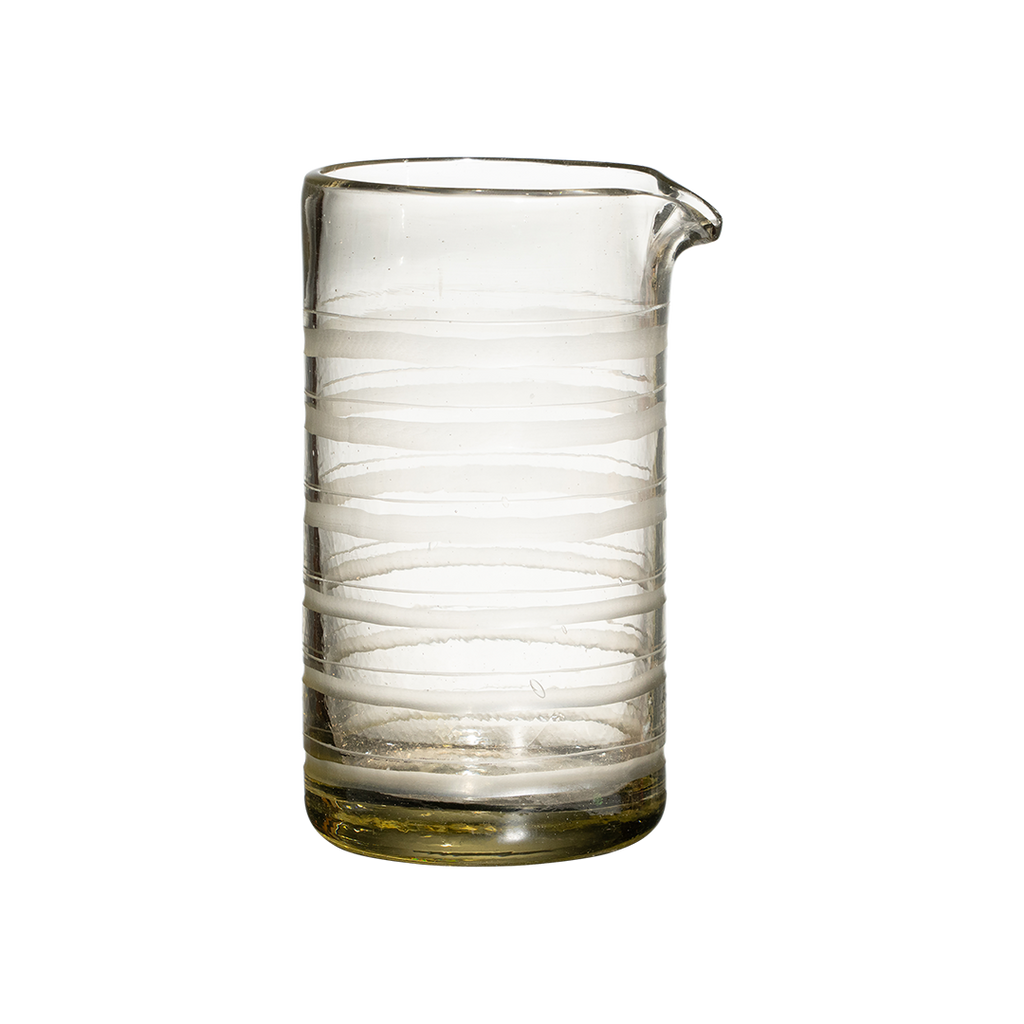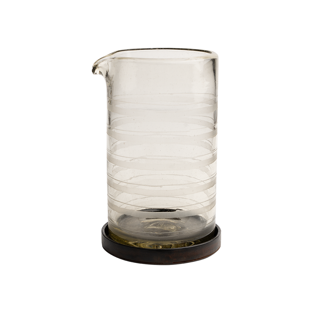 Classic cocktail mixing glass for all your favorite recipes . . . old fashioned, martini . . . mouth blown glass with halos engraving with a removable iron coaster lined with suede . . . pairs great with our long Cuchara spoon