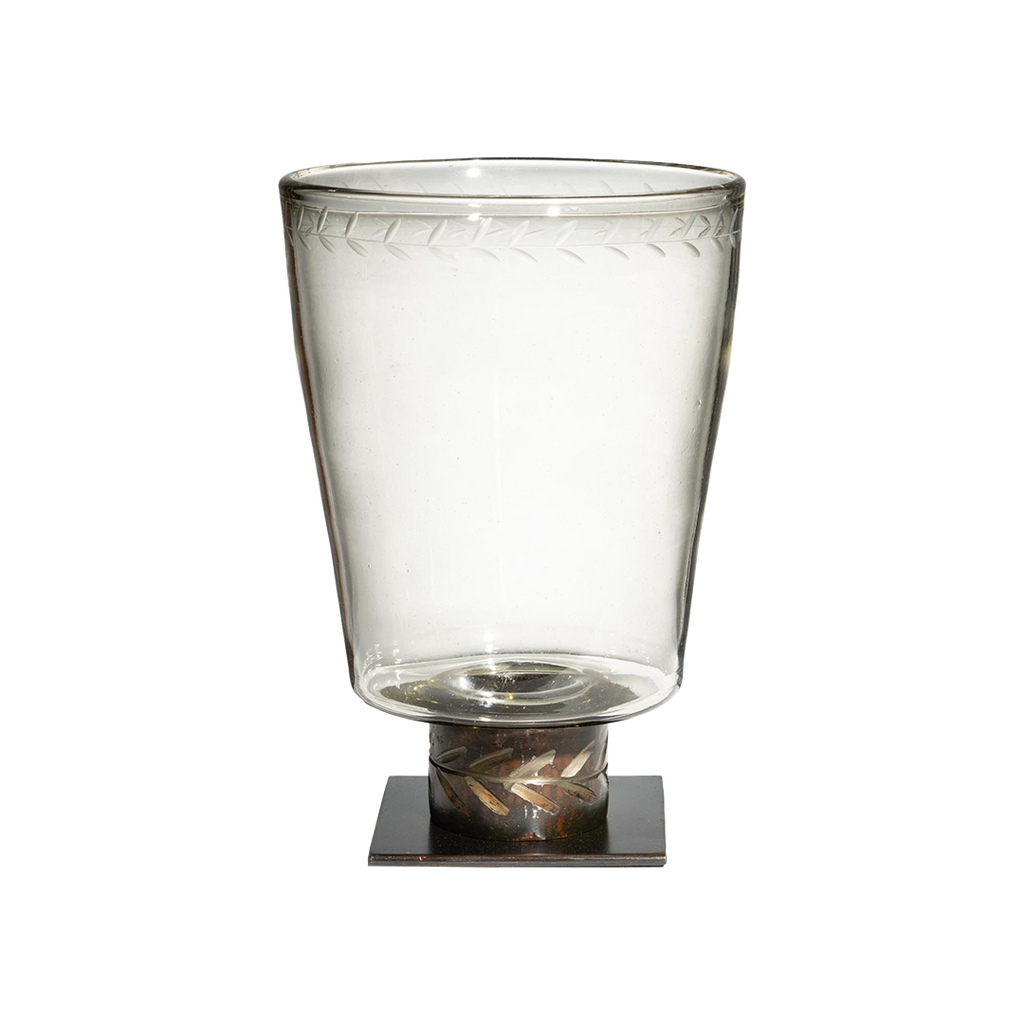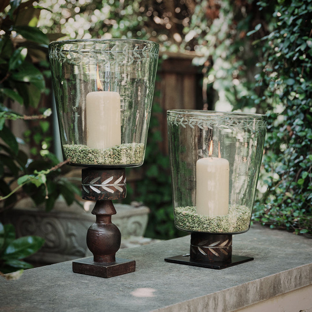 Mouth blown glass hurricane with laurel engraving resting atop a forged iron base with laurel engraving . . . candles, flowers, branches