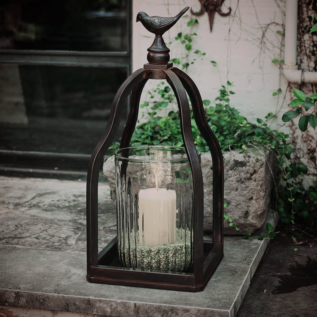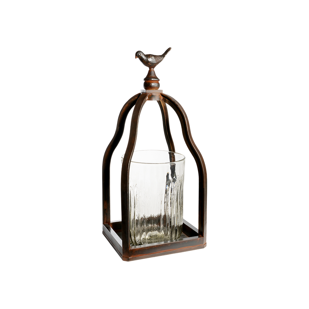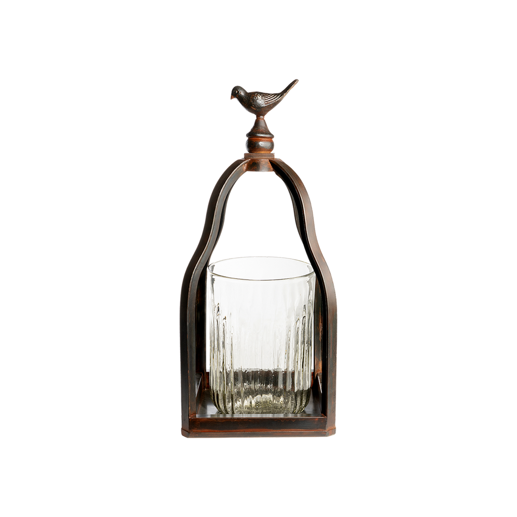 Hand forged iron hurricane/lantern with wax cast iron bird top - includes a removable ribbed mouth blown glass hurricane . . .
