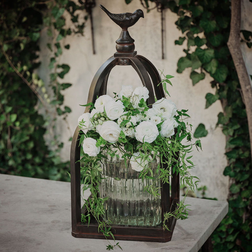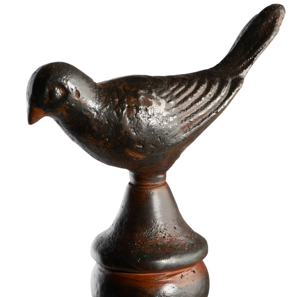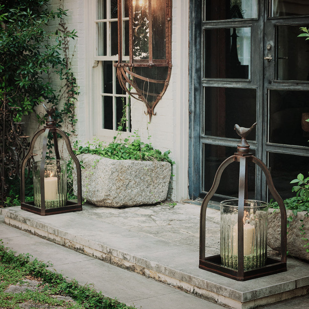 Hand forged iron hurricane/lantern with wax cast iron bird top - includes a removable ribbed mouth blown glass hurricane . . .