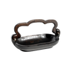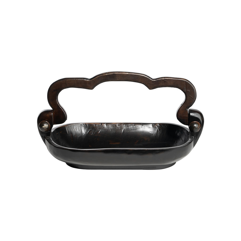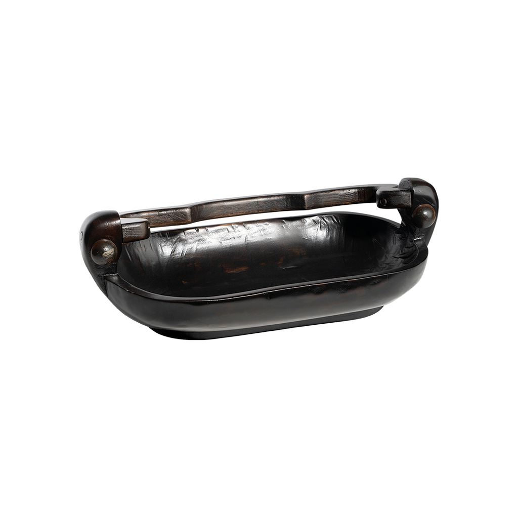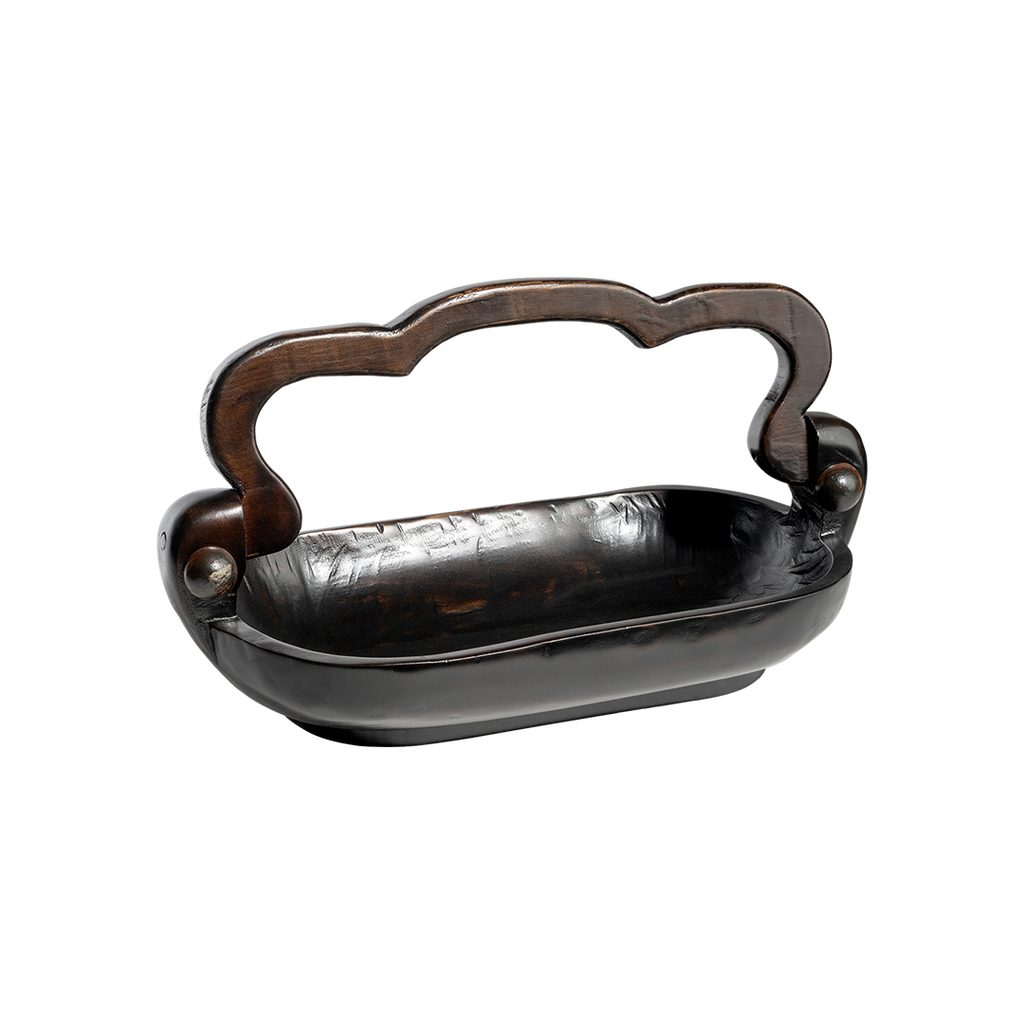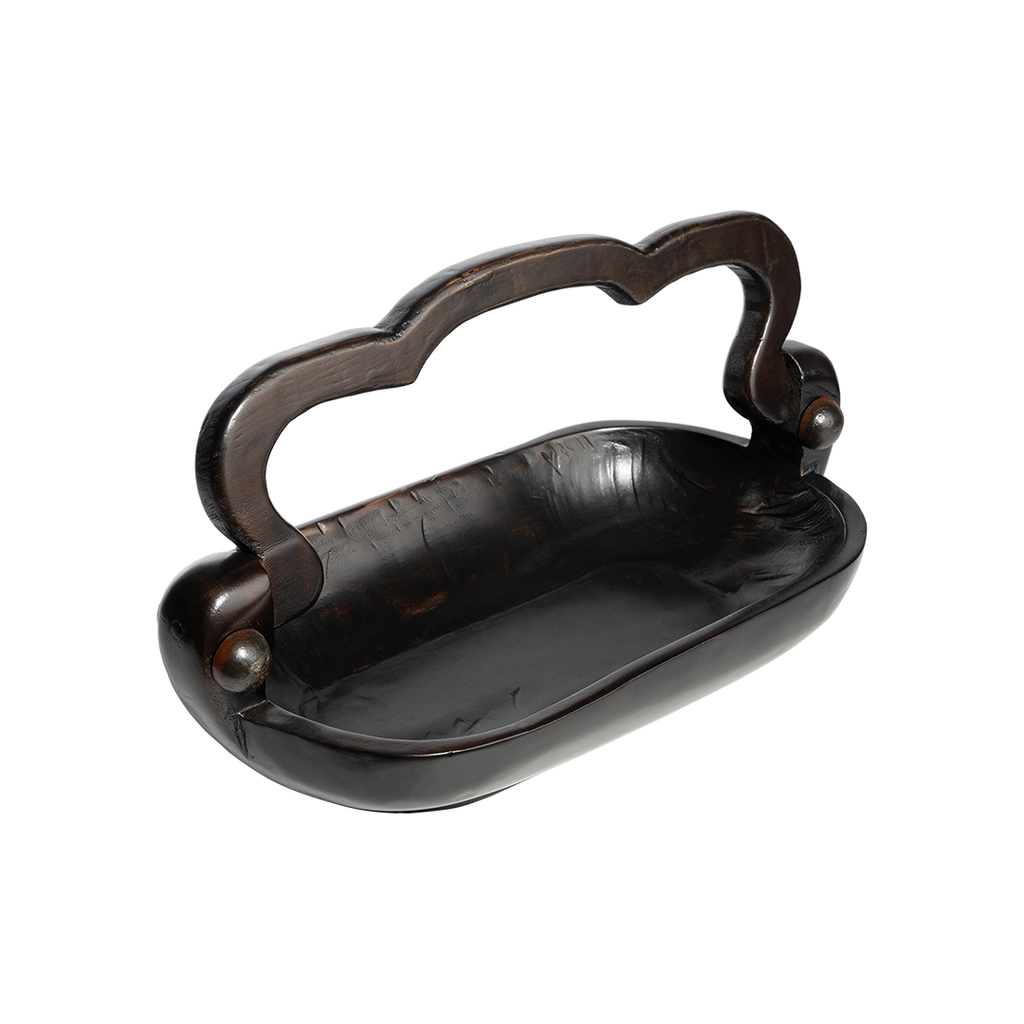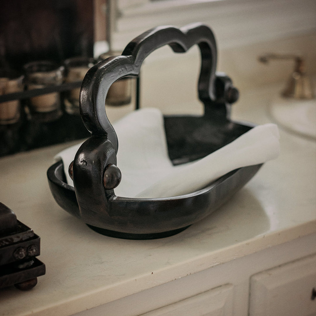 Beautifully hand carved primitive wood basket with movable handle that dons iron balins . . . bread, fruit, hand towels, soaps . . .