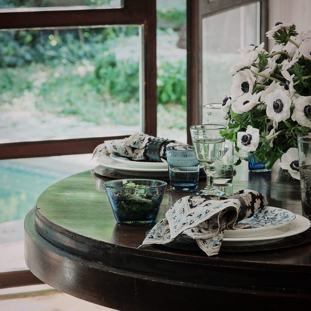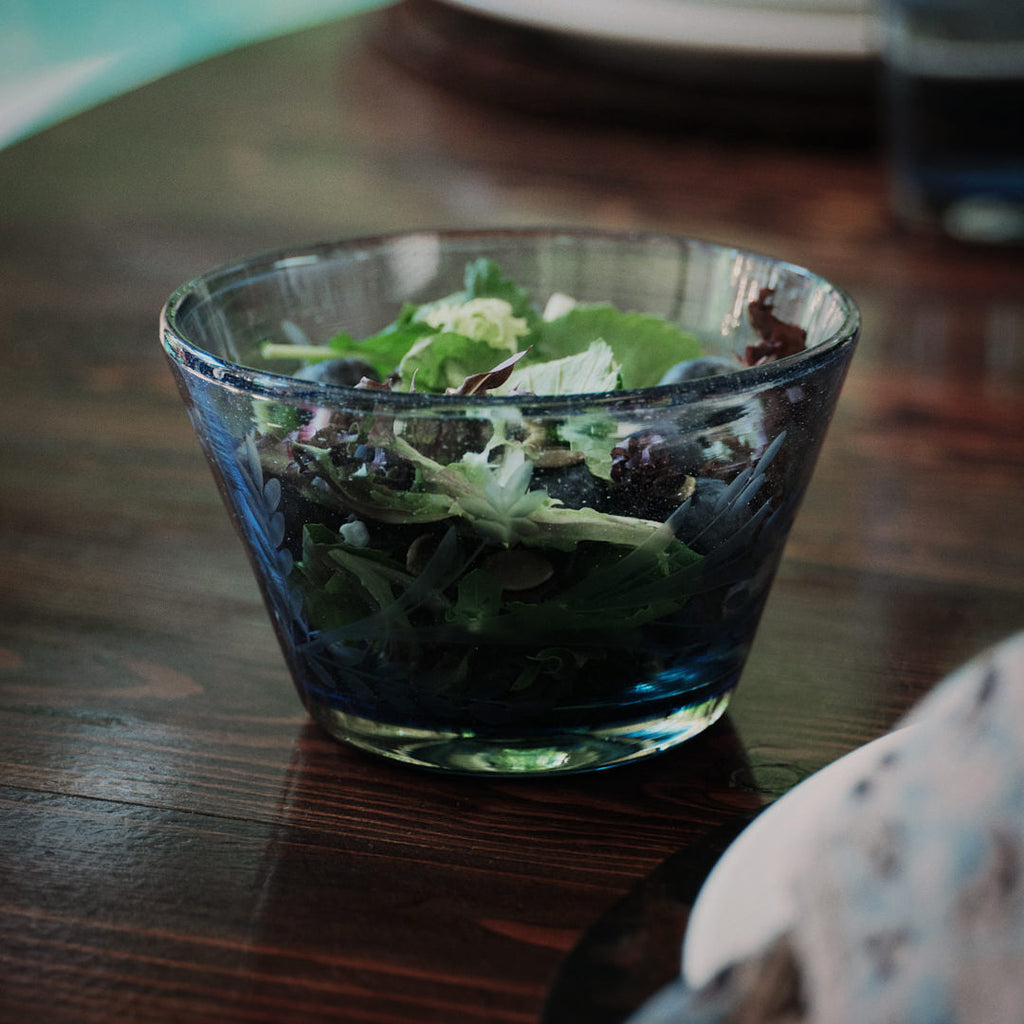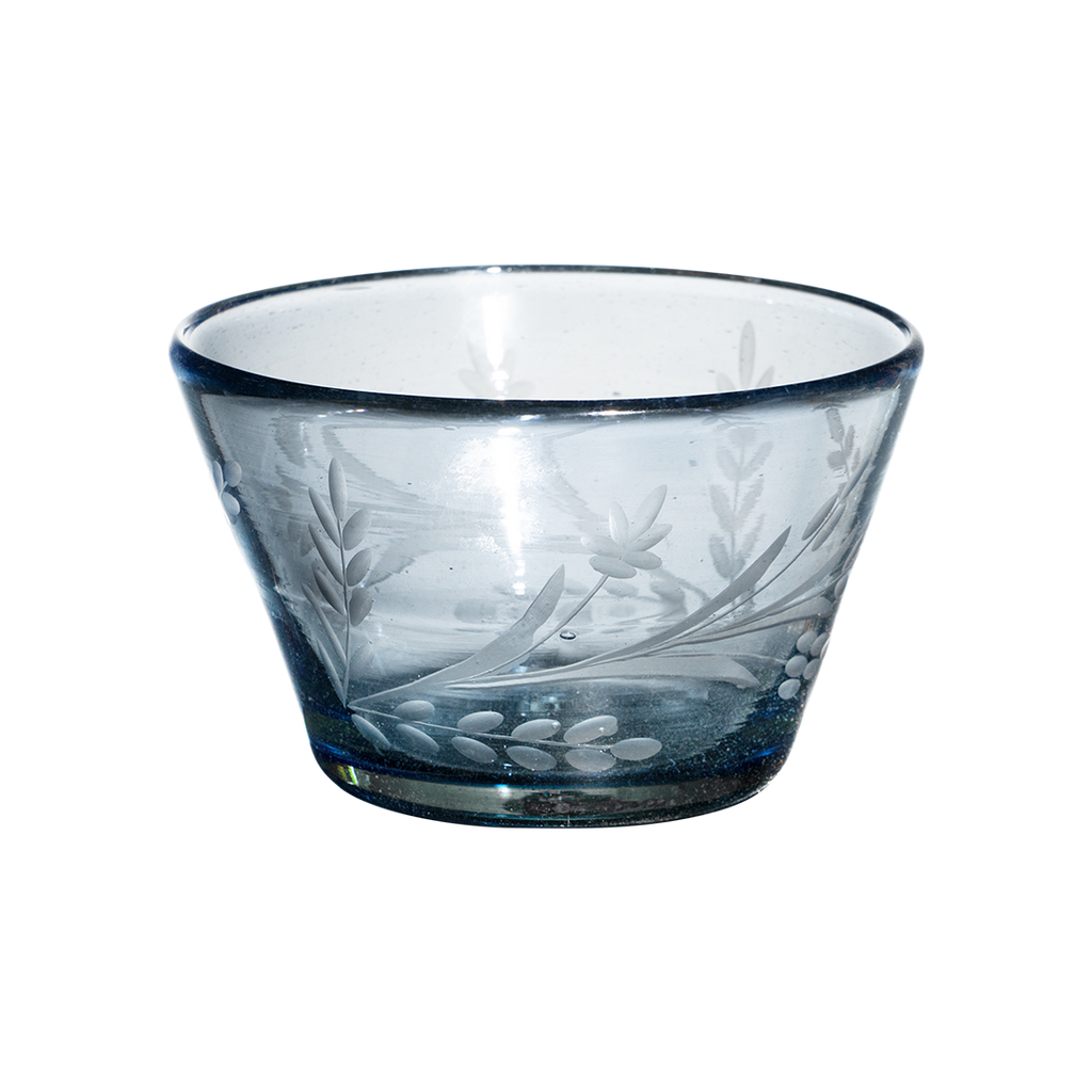 Small mouth blown blue glass bowl with pepita engraving